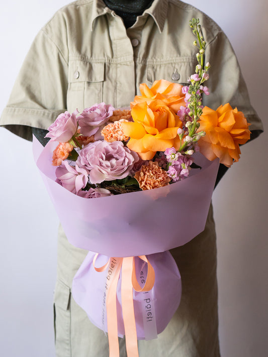 Buchet mov-portocaliu cu Trandafiri speciali și Matthiola