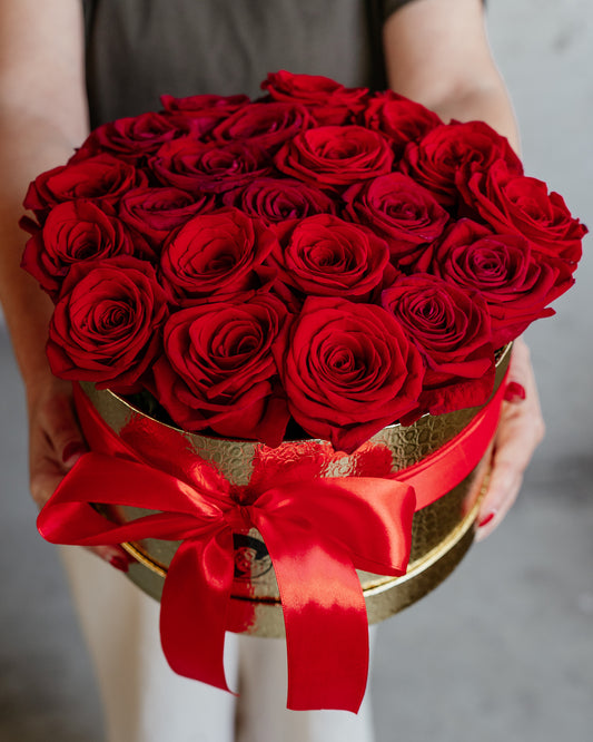 Cutie aurie rotundă XL cu 25 Trandafiri roșii