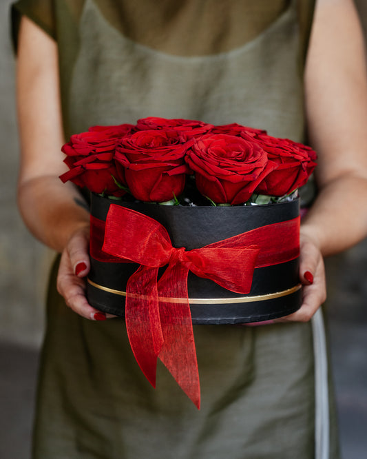 Cutie neagră rotundă M cu 11 Trandafiri roșii