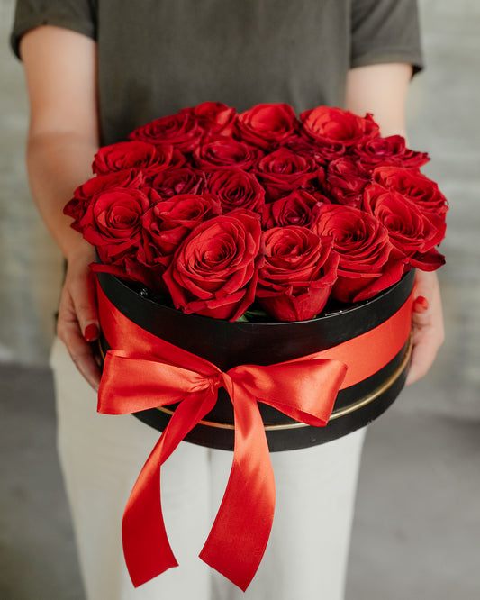 Cutie neagră rotundă XL cu 25 Trandafiri roșii