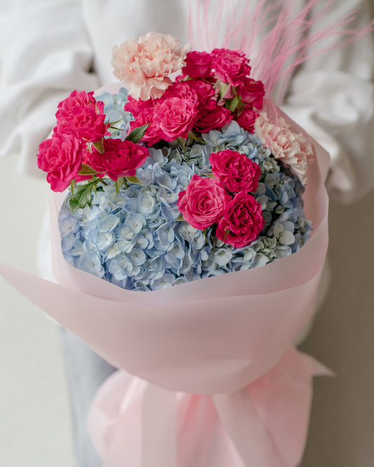 Buchet Hortensii, Miniroze, Garoafe albastru-țiclam-roz