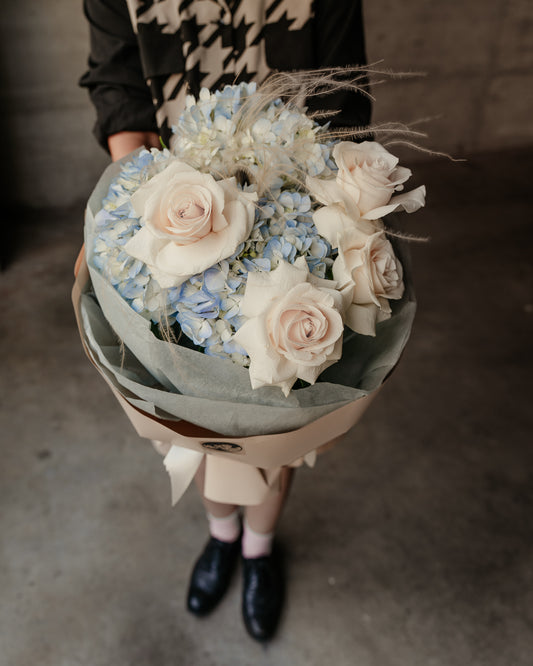 Buchet cu Hortensii și Trandafiri alb-albastru