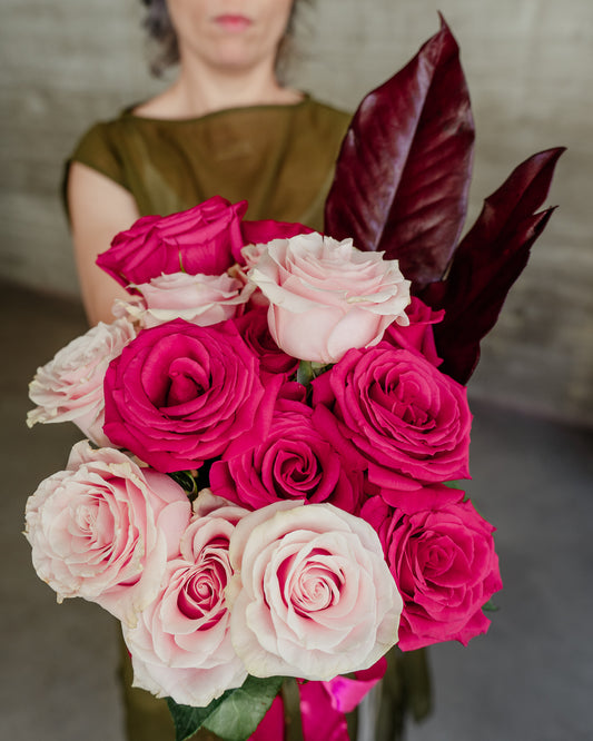 Buchet cu 15 Trandafiri și frunze de Magnolia, țiclam-roz