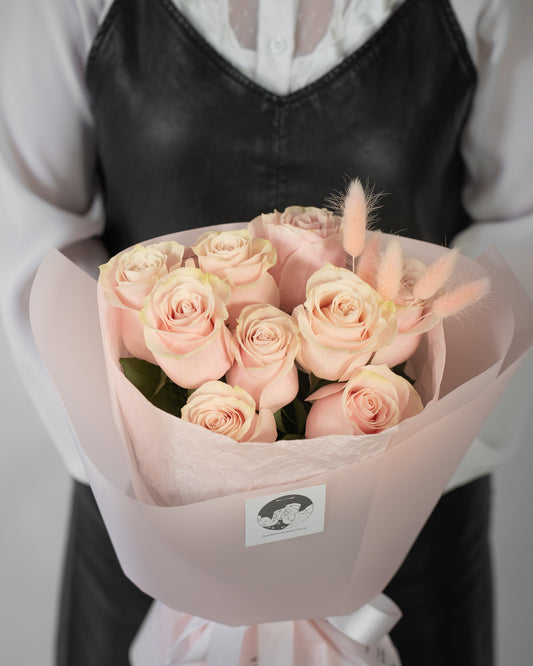 Buchet peach-vișiniu cu Germini, Trandafiri și Leucadendron