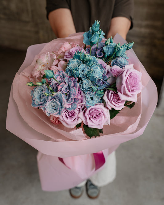 Buchet Trandafiri, Eustoma, Alstroemeria, mov-albastru