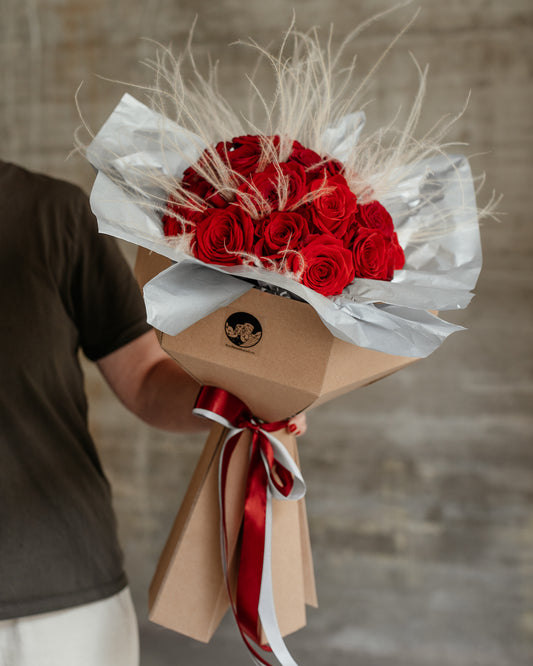 Buchet XL cu 25 sau 35 Trandafiri roșii și Pene Stipa în holder carton craft