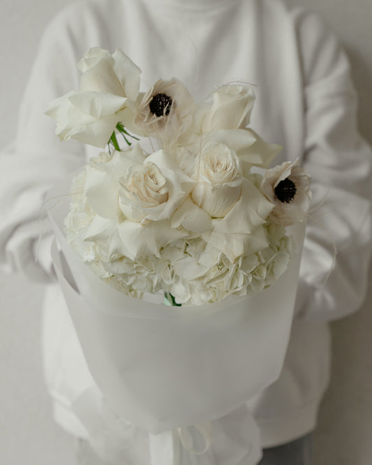 Buchet cu flori albe Trandafiri, Hortensii și Anemone