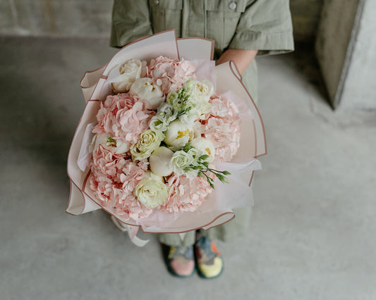 Buchet cu Hortensii și Trandafiri alb-roz