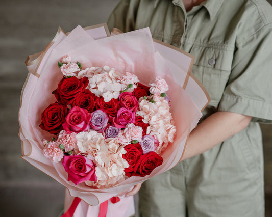 Buchet Hortensii, Trandafiri, Garofițe, roșu-roz-mov