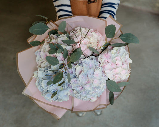 Buchet Hortensii, albastru-roz pal