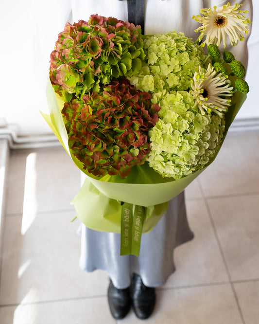Buchet roz cu Germini, Hortensii și Trandafiri