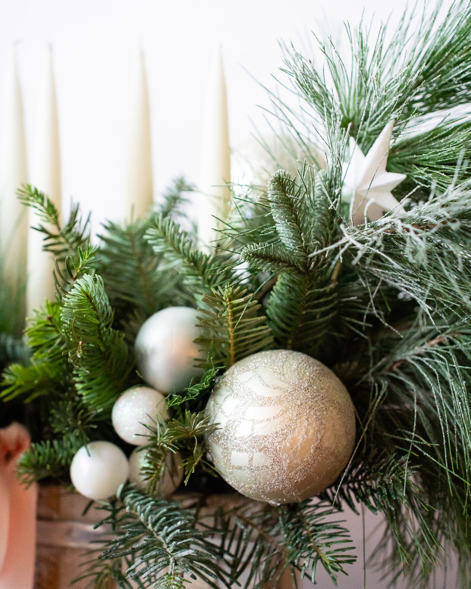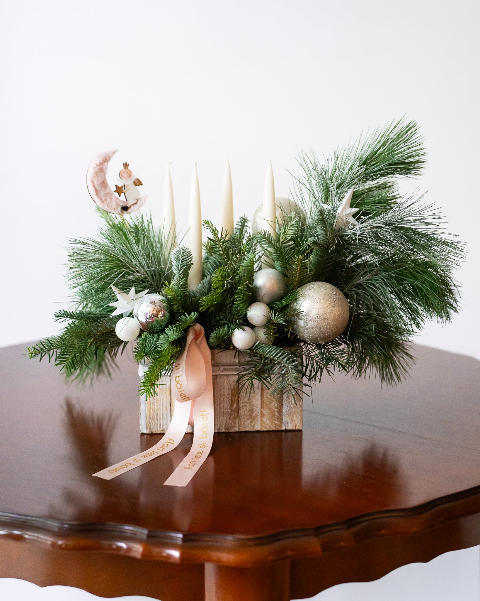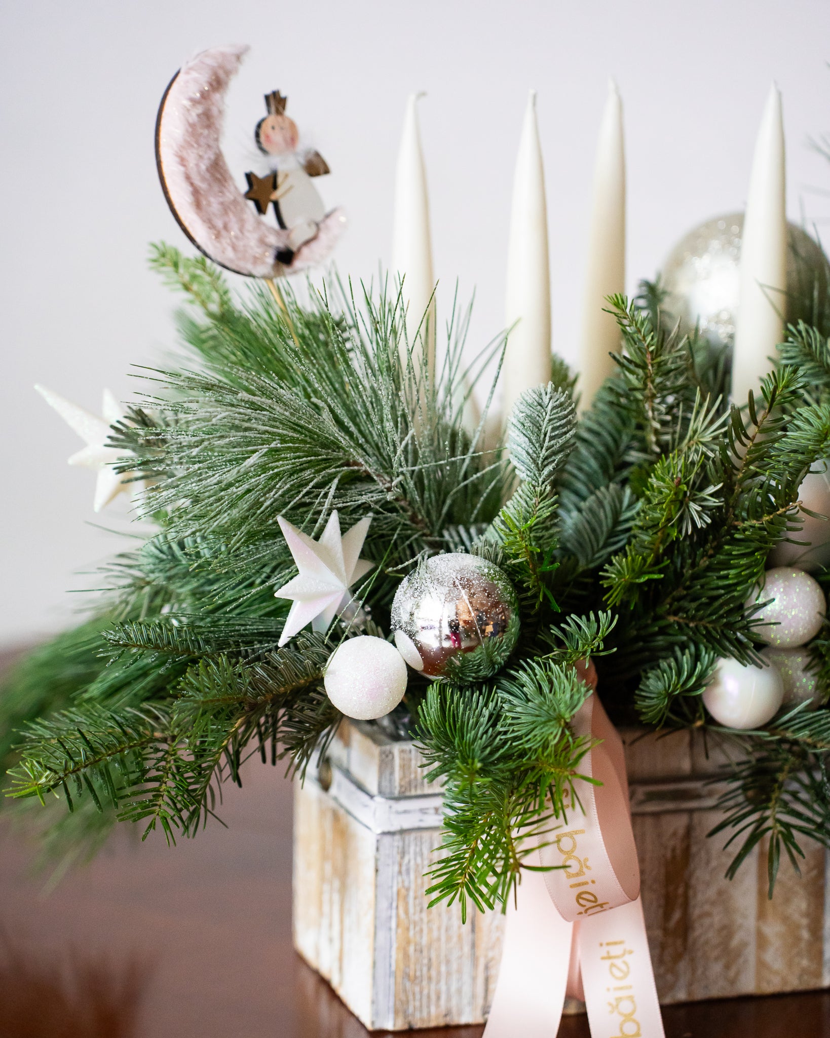 Conținutul aranjamentului: Brad, Pin, globuri, lumânări, accesirii decorative.
