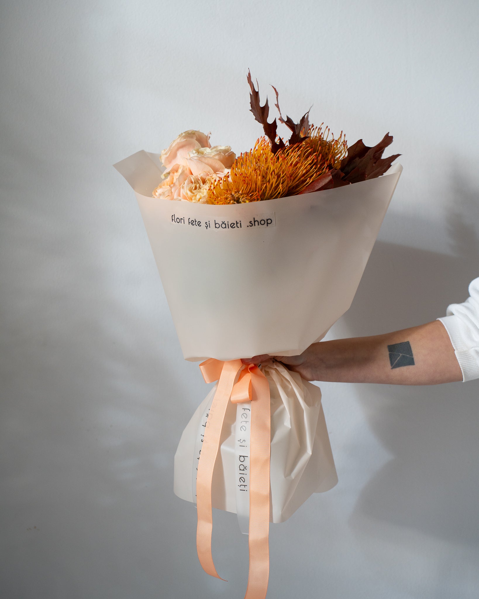 Conținutul buchetului: 6 Trandafiri, 5 Leucospermum, 2 Quercus.