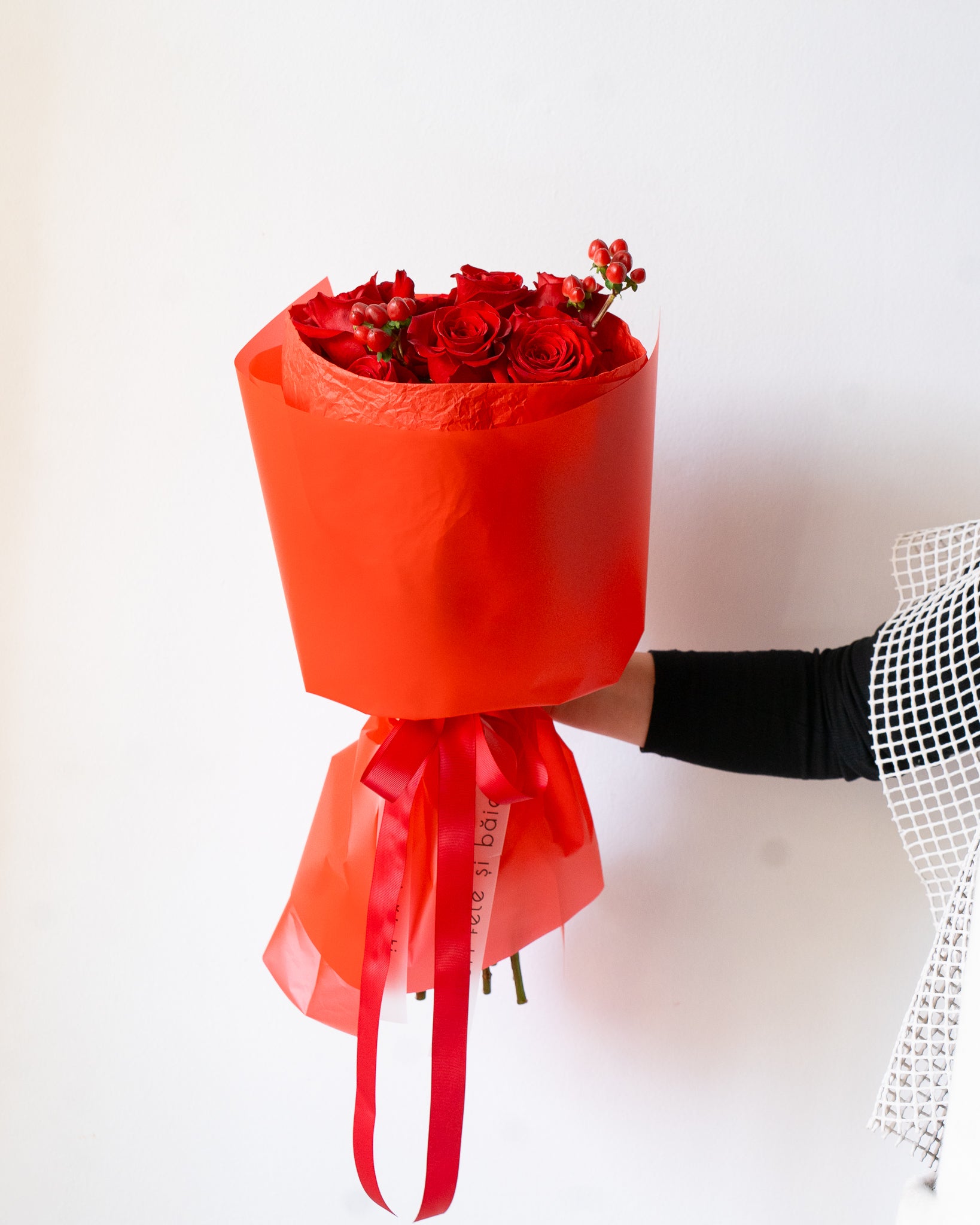 Conținutul buchetului: 13 Trandafiri roșii și 2 Hypericum.
