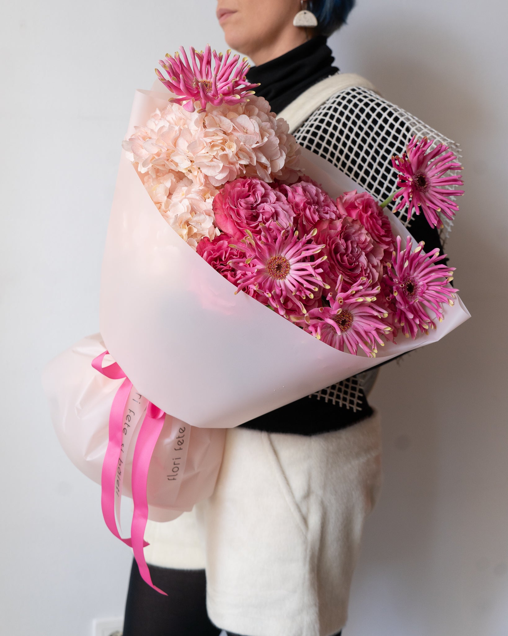 Buchet roz cu Germini, Hortensii și Trandafiri