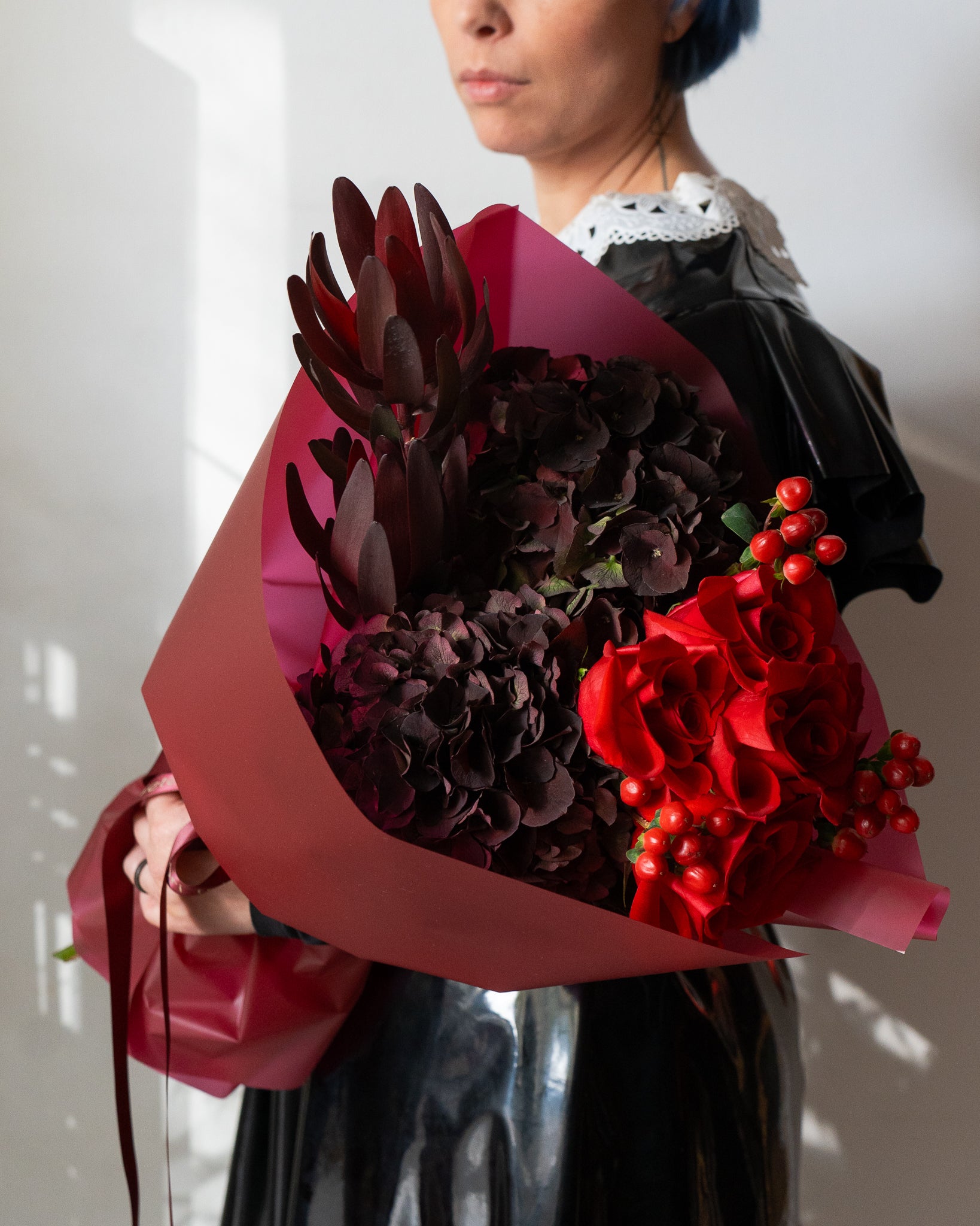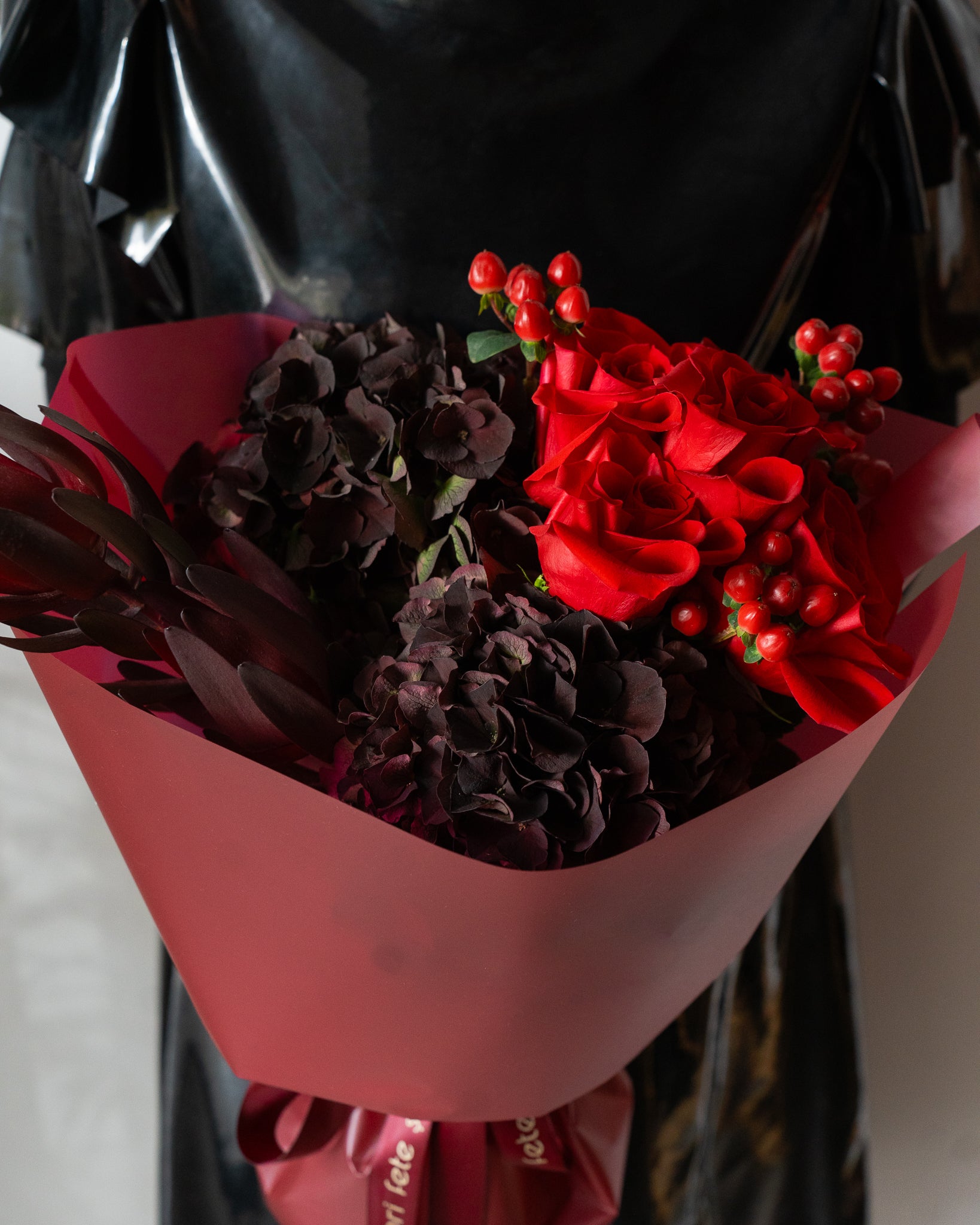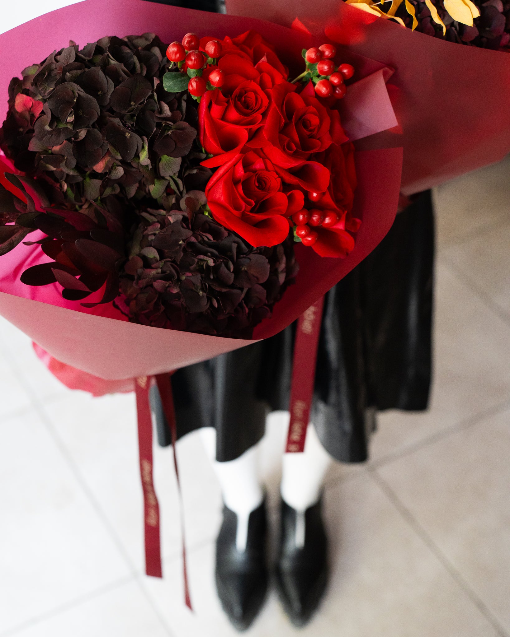 Buchet vișiniu cu Hortensii și Trandafiri