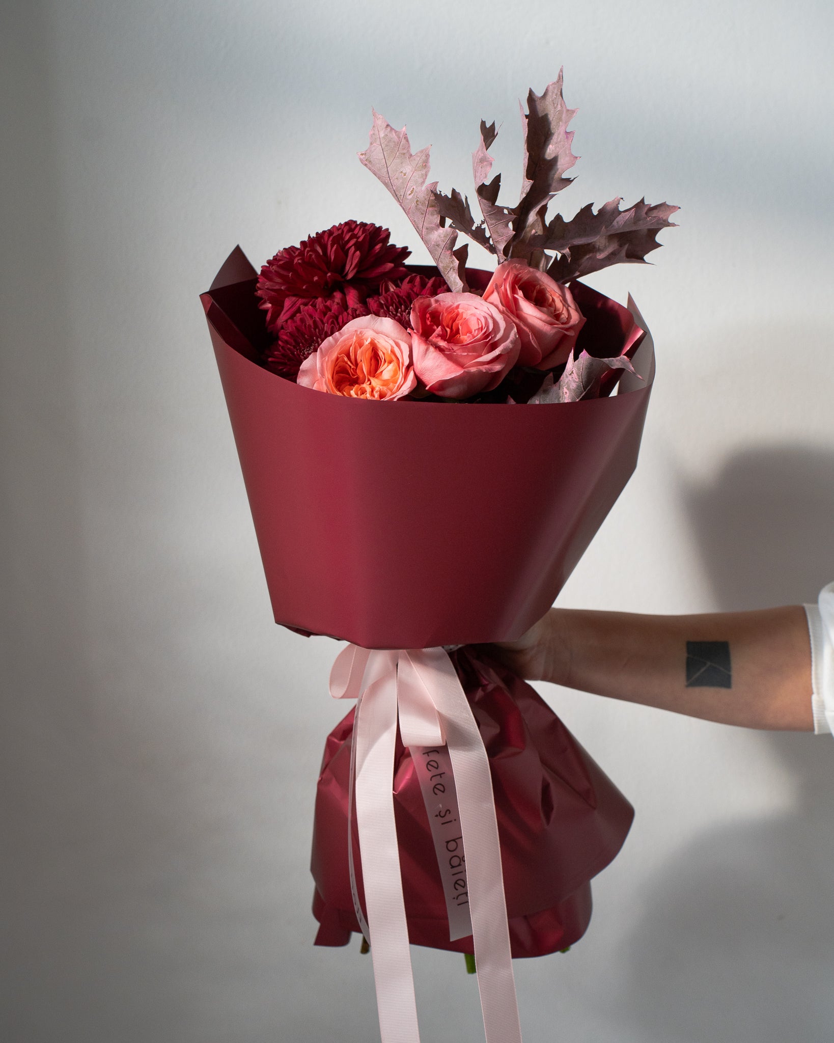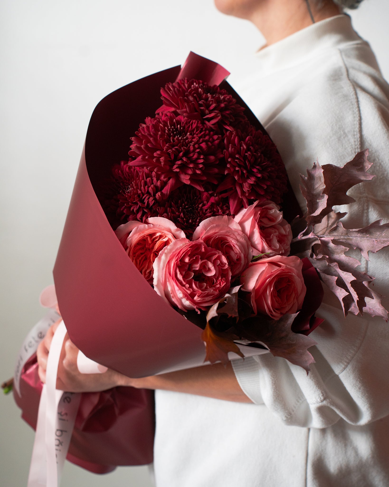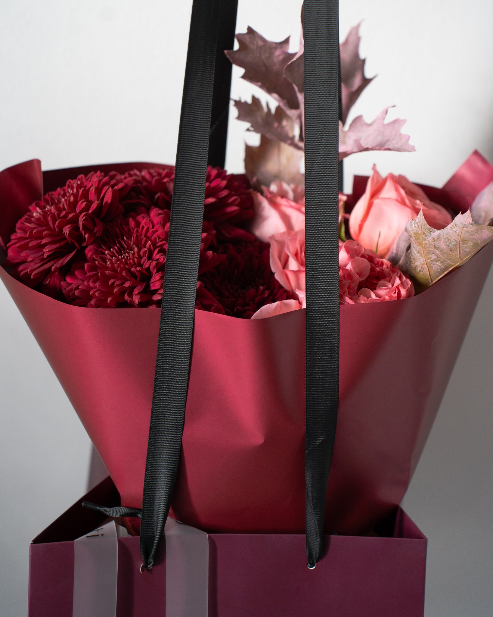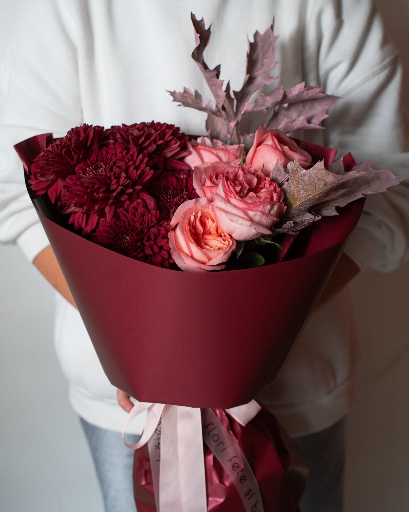 Conținutul buchetului: 4 Trandafiri, 5 Chrysantemum, 2 Quercus.