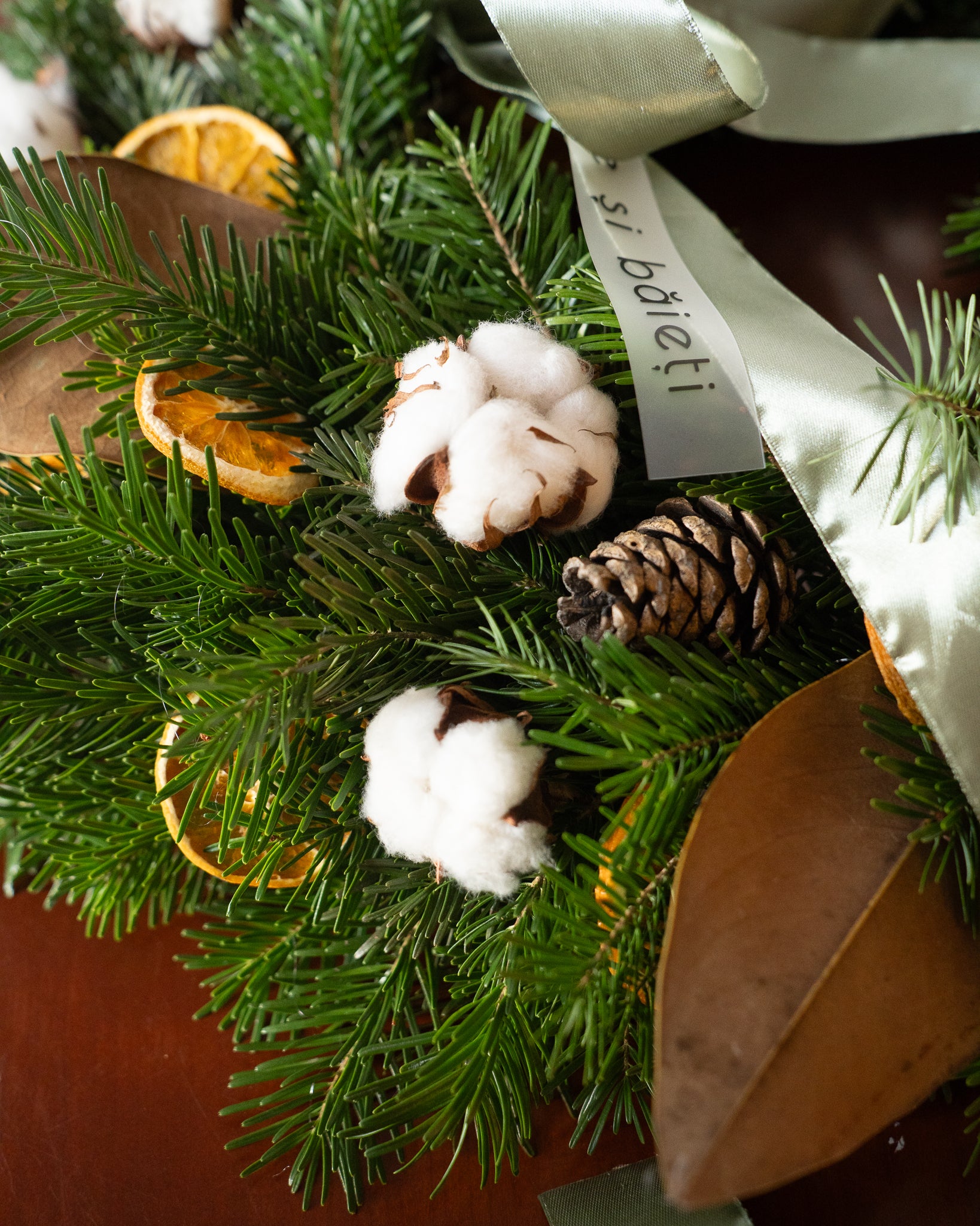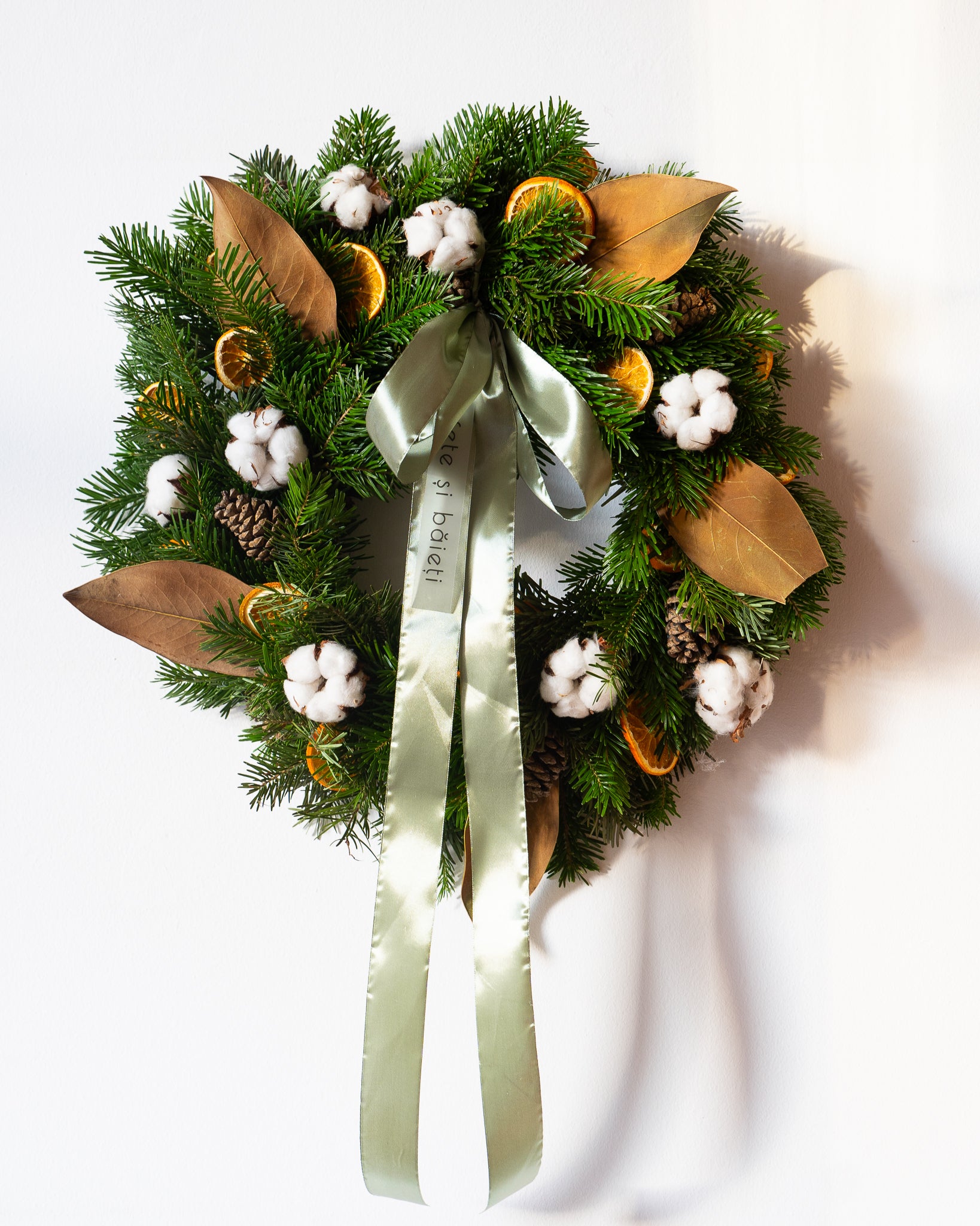 Conținutul aranjamentului: Brad, bumbac, felii de portocale deshidratate, conuri, frunze de magnolia, fundiță. 40cm