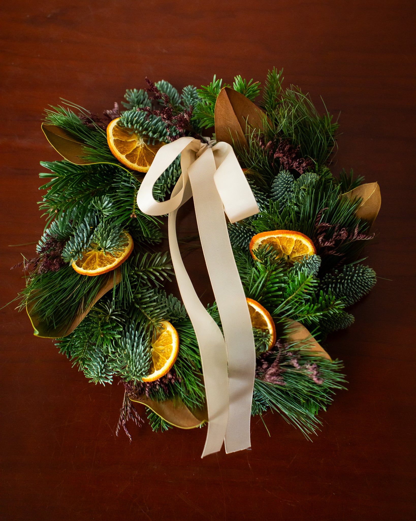 Conținutul cutiei: brad Normandian, brad Nobilis, Pin, Limonium, felii de portocale deshidratate, frunze de Magnolia, inel suport pentru coroniță, sârmuliță, panglică.
